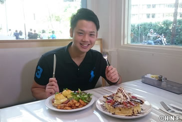 続いてランチでパンケーキのお店に入ると「エッグベネディクト」と「バナナスフレパンケーキ」を注文します。「しょっぱいものと甘いもの両方」と言いながら二つのパンケーキをペロリと平らげるのはさすがプロ野球選手。「フワフワの生地に、意外と甘すぎないクリームが美味しい」と満面の笑みを浮かべます。