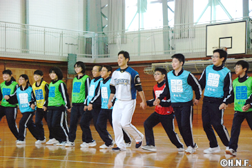 今回実施する12球団全33選手の中で唯一北海道内開催となった「夢の教室」には鍵谷投手がユニフォーム姿で登場。前半「ゲームの時間」では約40名の生徒と体を使ったゲームに挑戦しました。生徒が集まり作戦を立てる場面では、鍵谷先生が子どもに意見を促し率先してチームを課題解決へ導く姿が印象的で、選手会役員としてチーム、ブルペンを取りまとめる姿そのものでした。