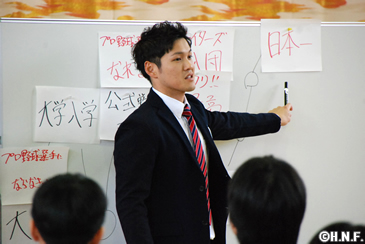 後半「トークの時間」ではスーツ姿で再び全校生徒の前に登場。夢をもったきっかけや、夢に向かう中でどの様な困難があり、それをどう乗り越えてきたかを「夢曲線」を使って自身の体験を紹介しました。中でも北海高校時代、平成19年秋季北海道高等学校野球大会で初戦敗退をしたエピソードで「これだけ厳しい練習をしたのに勝てなかった」と当時を振り返りながらも「この仲間と勝利をしたい。だからやらされる練習ではなく、自分たちで考えてやる練習にした。そして他人が嫌がることでも率先してやるように心がけた」と熱く語りました。