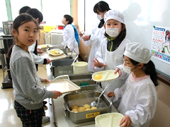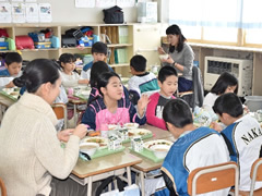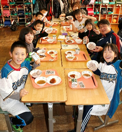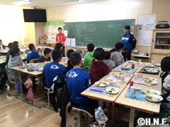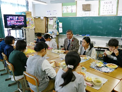 選手表敬訪問時に合わせ給食の献立を考え、当日は各選手より「食の大切や給食にまつわるエピソード」などを話していただき、子供たちも食事の大切や目的を理解しながら、給食を食べていました。