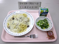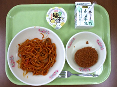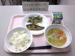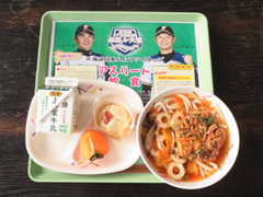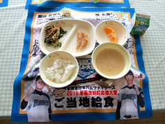 なかなか選手の出身地ものでそろえるという事に苦労しましたが浦野投手の出身地である静岡県産のお茶を使用したプリンや近藤選手の出身地の千葉県特産のいわしを使った梅煮、ピーナッツ和えに、選手の好物であるスパゲティを献立に組み込みました。子ども達にも安心、安全でおいしい給食が提供でき、このような企画に参加できよかったなと感じました。