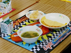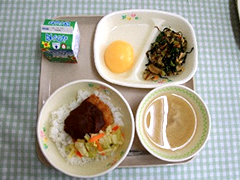 新垣投手の好きな「オムライス」をメインに中島卓選手の出身地福岡県の名産「明太子」と北海道のジャガイモを合わせた「タラモサラダ」とレアード選手が昔苦手だったが克服したレバーを混ぜて作ったミートボールをいれた「コンソメスープ」を献立にしました。今回は新メニューばかりを取り入れ、子ども達に日本一になった選手のように嫌いな食べ物を克服し、丈夫な身体作りを目指してほしいという思いで用意をしました。