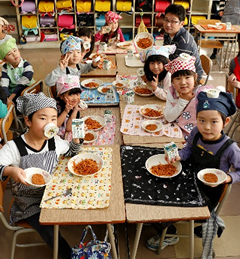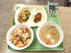 中田選手よりぜひ食べてほしいとリクエストのあったご当地グルメの「たこめし」をメインに広島の郷土料理のだんご汁を組み合わせました。「たこめし」を初めて食べる子も多く関心を持って食べている姿や中田選手のように力を発揮できるようにと好き嫌いせず食べる姿を見ることができました。今回の企画で子どもたちが自分のふるさとの味を大切にする気持ちが芽生えてくれたらと思います。