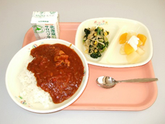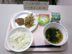 1日目は両選手が学生時代好きだった給食メニューのカレーとフルーツのゼリーあえを合わせ提供しました。2日目は宮西投手が小中学校の給食で好きだった揚げパンをメインに肉団子スープ、ミートマカロニを提供しました。子供たちにはプロの選手になった人も毎日おいしい給食を食べ丈夫で大きな身体になったことを伝えることができたと思います。