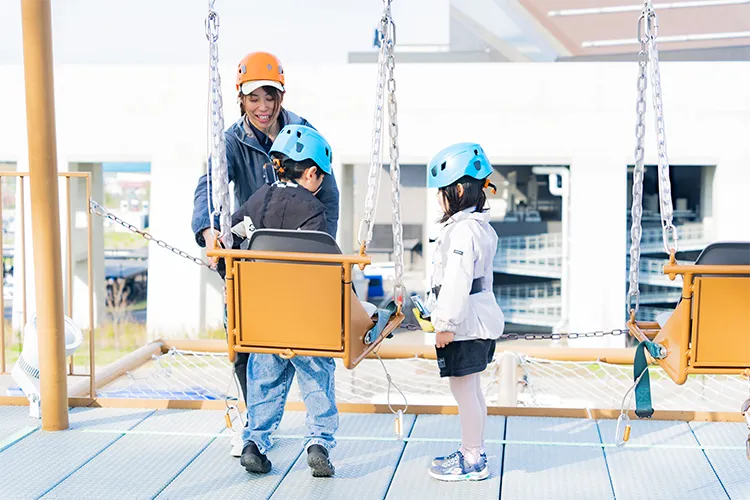 アスレチックの運営スタッフになろう!安全を確認しながら実際にブランコ操作を行います。