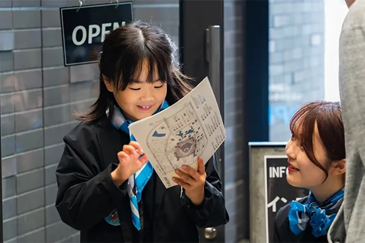 インフォメーションスタッフになろう!接客練習をしたあと、インフォメーションセンターでゲストの困りごとをサポートします。