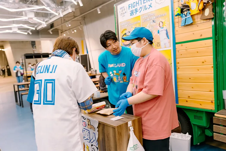 ユニフォームをお客様にお渡ししよう!球場に来たお客様からチケットを受け取りユニフォームと交換します。