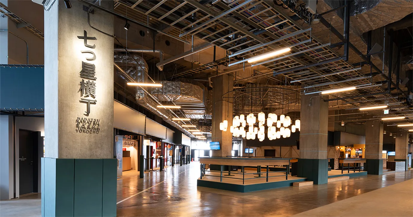 七つ星横丁 | 横丁へ一歩踏み入れると、入口には提灯がずらり。歩くと、各店の軒先が出迎え、誘うような美味しい香りが漂う。昭和のレトロ感と現代デザインが調和した空間をご堪能あれ。